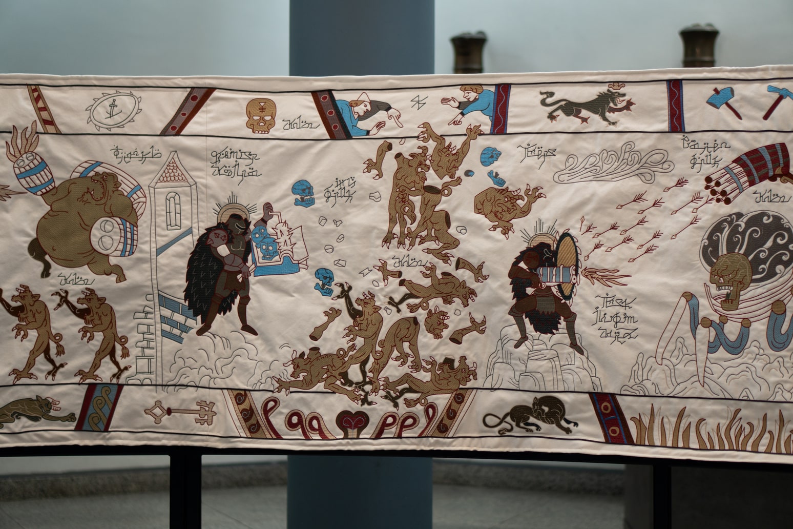 Fortunately, we found the perfect partners in Simon de Thuillières, Hawthorne & Heaney and the Royal Armouries in Leeds. Simon, an illustrator from France, who specialises in medieval art, happened to be a huge DOOM fan. He has done an excellent job in translating the trailer for DOOM: The Dark Ages into a digital illustration in the Norman Romanesque style. Hawthorne & Heaney took on the task of turning Simon’s illustration into a very real and tangible tapestry. Unlike the original creators of the Bayeux Tapestry, we had the assistance of embroidery machines, which made the ambitious task slightly more manageable.